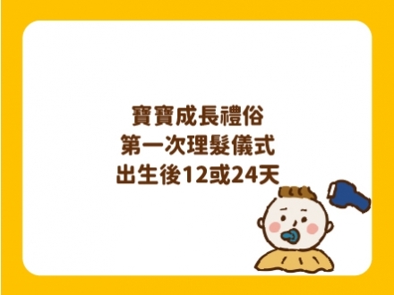 「在這天為寶貝剃除胎毛,去除穢氣!」 在出生滿12天或24天時,舉行『新生剃頭禮』, 藉此去除穢氣,期許孩子日後『頭殼定』, 也代表從「頭」開始,寶寶一生圓滿之意