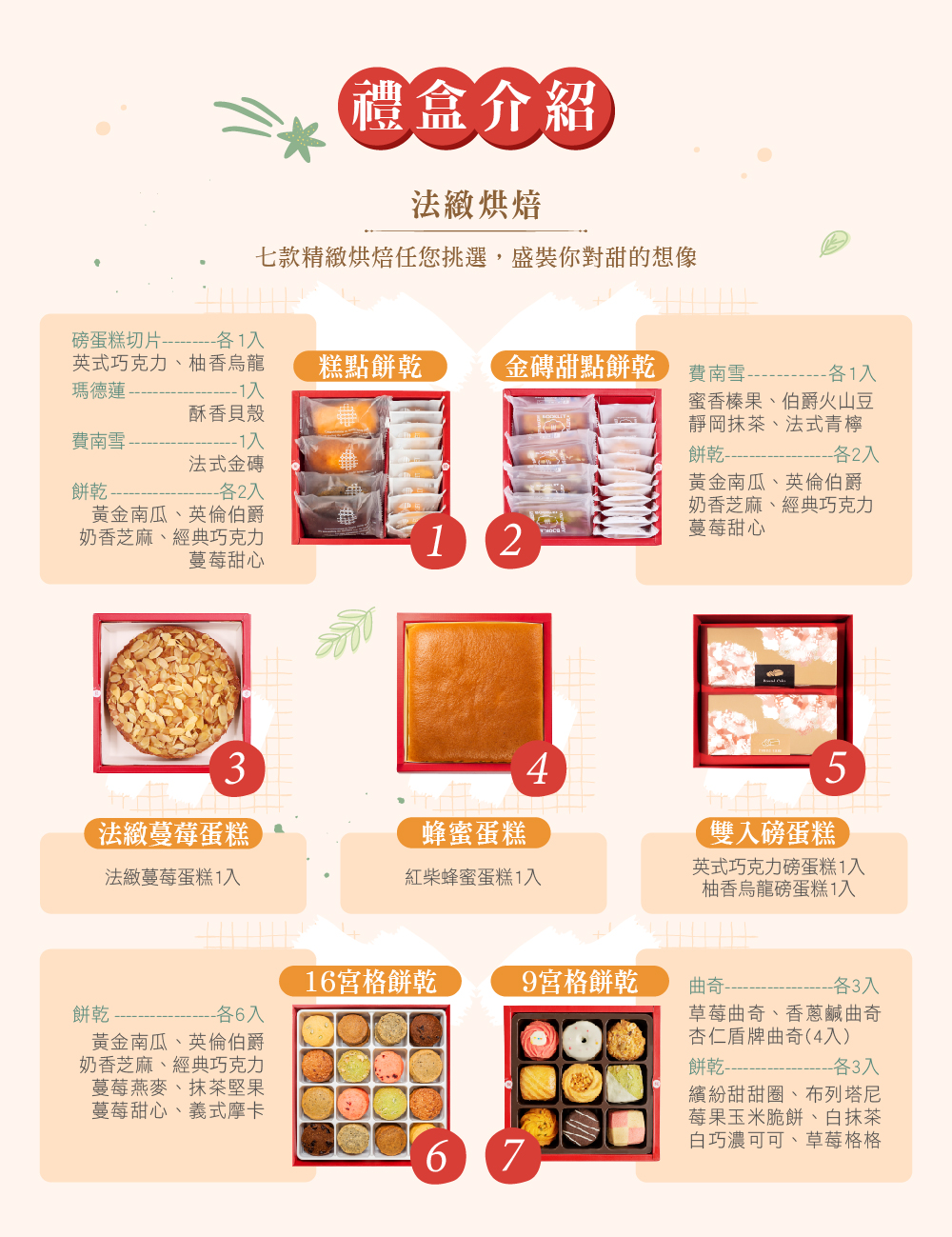 ⑷法緻蔓莓蛋糕 ⑸雙入磅蛋糕 ⑹十六宮格餅乾 ⑺九宮格餅乾
